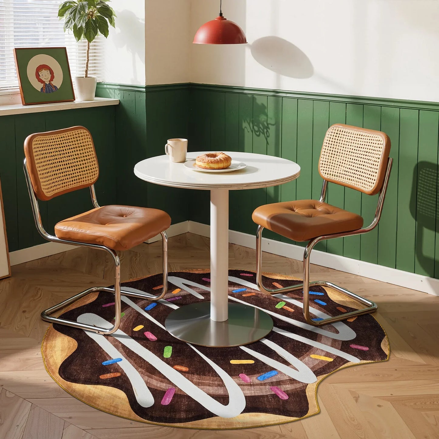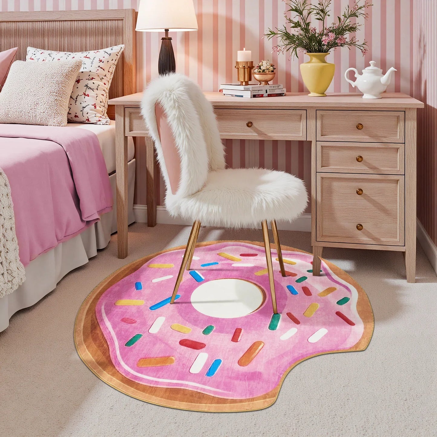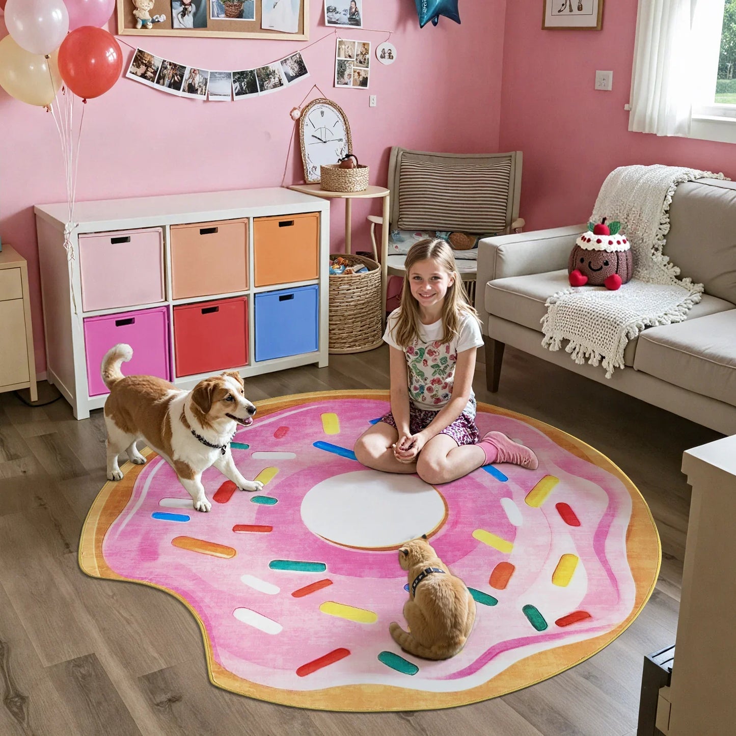 Sweet Strawberry Donut: Inspired by a frosted pink donut straight from a whimsical bakery, this rug features colorful sprinkles and a playful “bite” detail for extra charm. Its soft pastel tones instantly brighten any space, adding a cheerful, fun vibe—perfect for playful rooms or anyone who loves a touch of sweet décor.