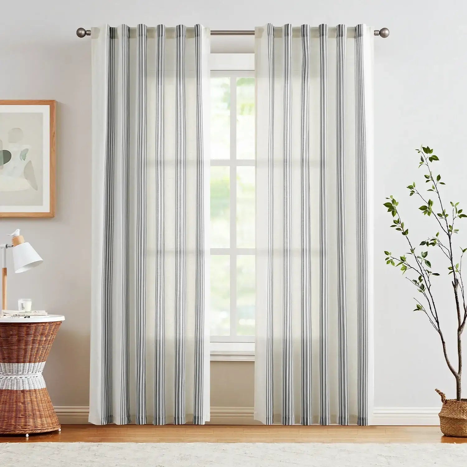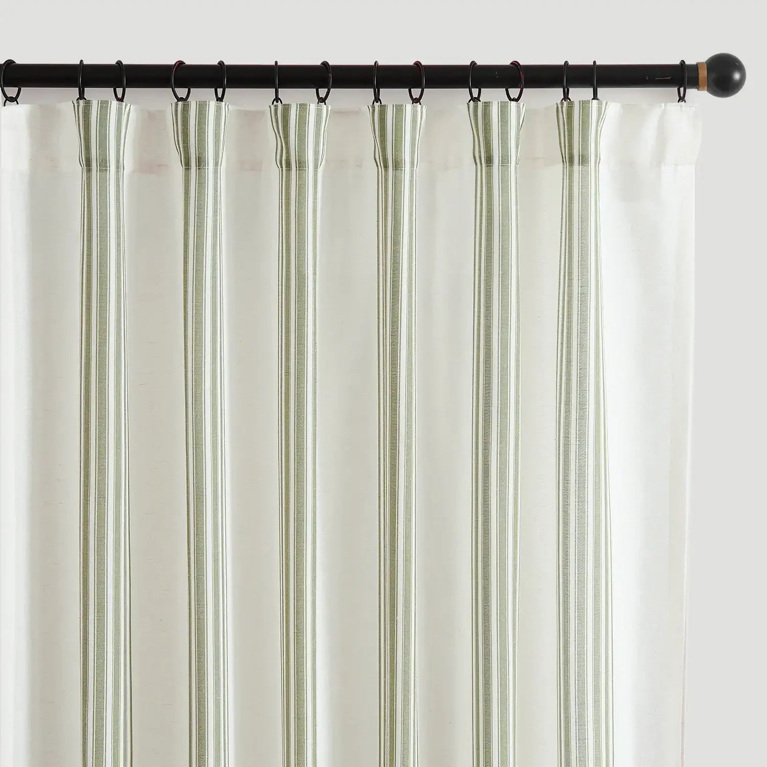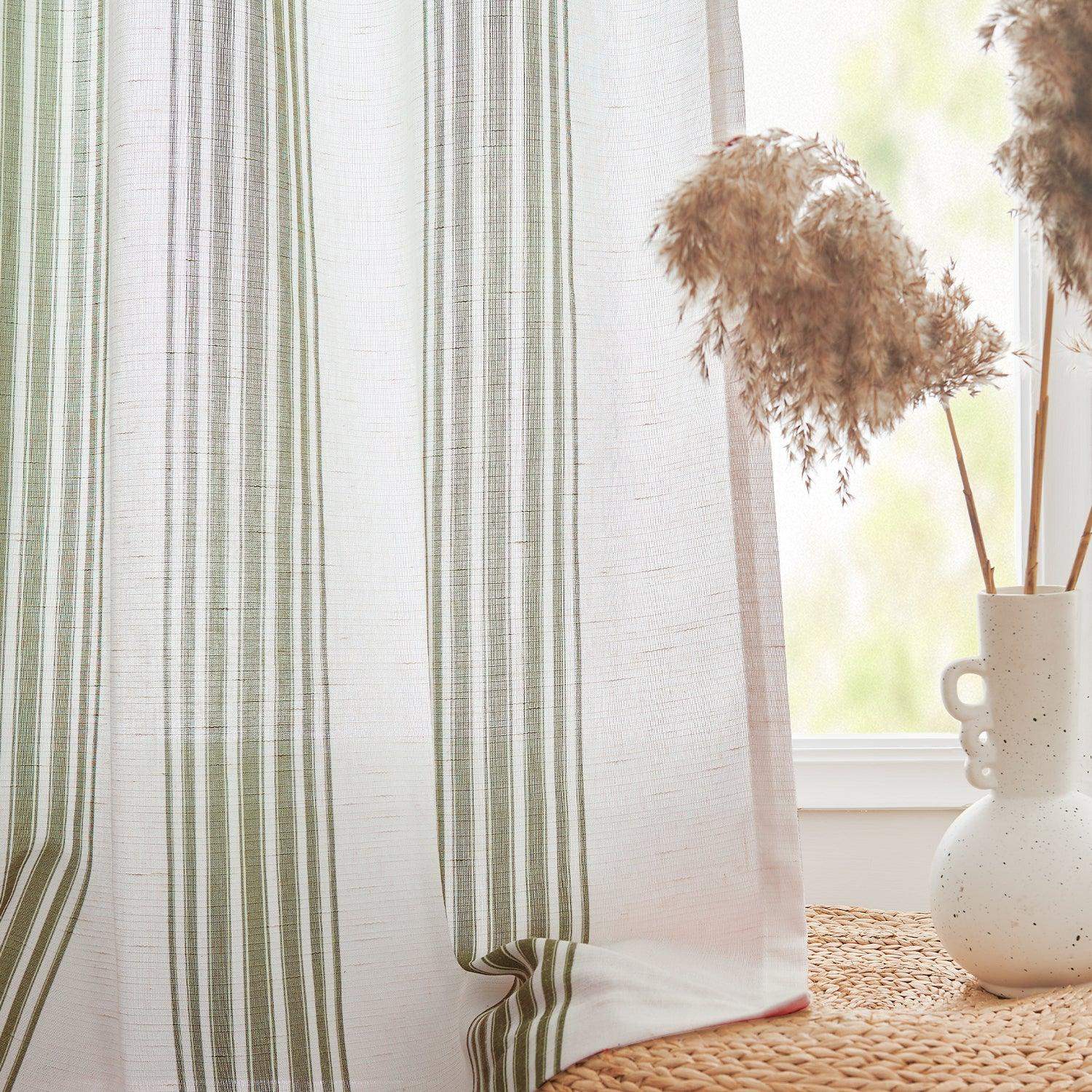 JINCHAN Balanced Stripe 3-in-1 Pleated Curtains bring a rustic yet modern touch to any room. Featuring classic Ticking Stripe patterns—narrow multi-colored vertical stripes alternating with wider background tones—these curtains add French country and farmhouse charm while creating a visually taller, brighter, and more open space. Made from a soft linen-blend fabric, the semi-sheer material allows natural light to brighten your room while providing everyday privacy. Each set includes two panels, designed to drape beautifully with gentle folds. With versatile 3-in-1 hanging options, these curtains fit most standard rods and complement a variety of home décor styles.