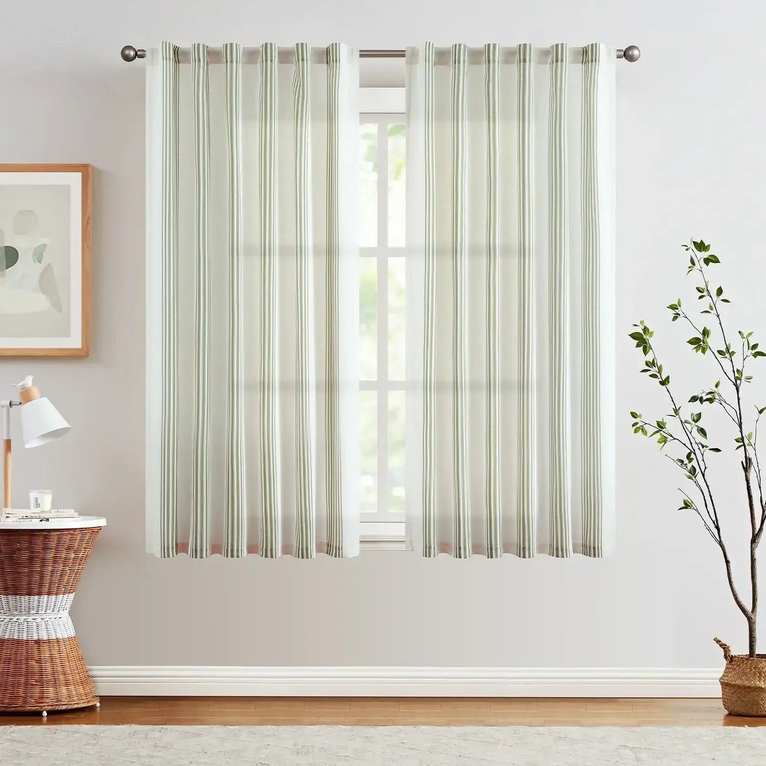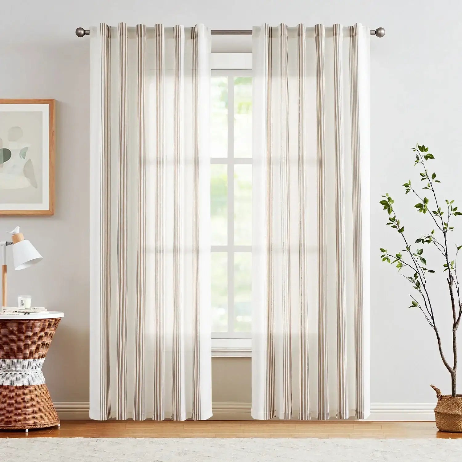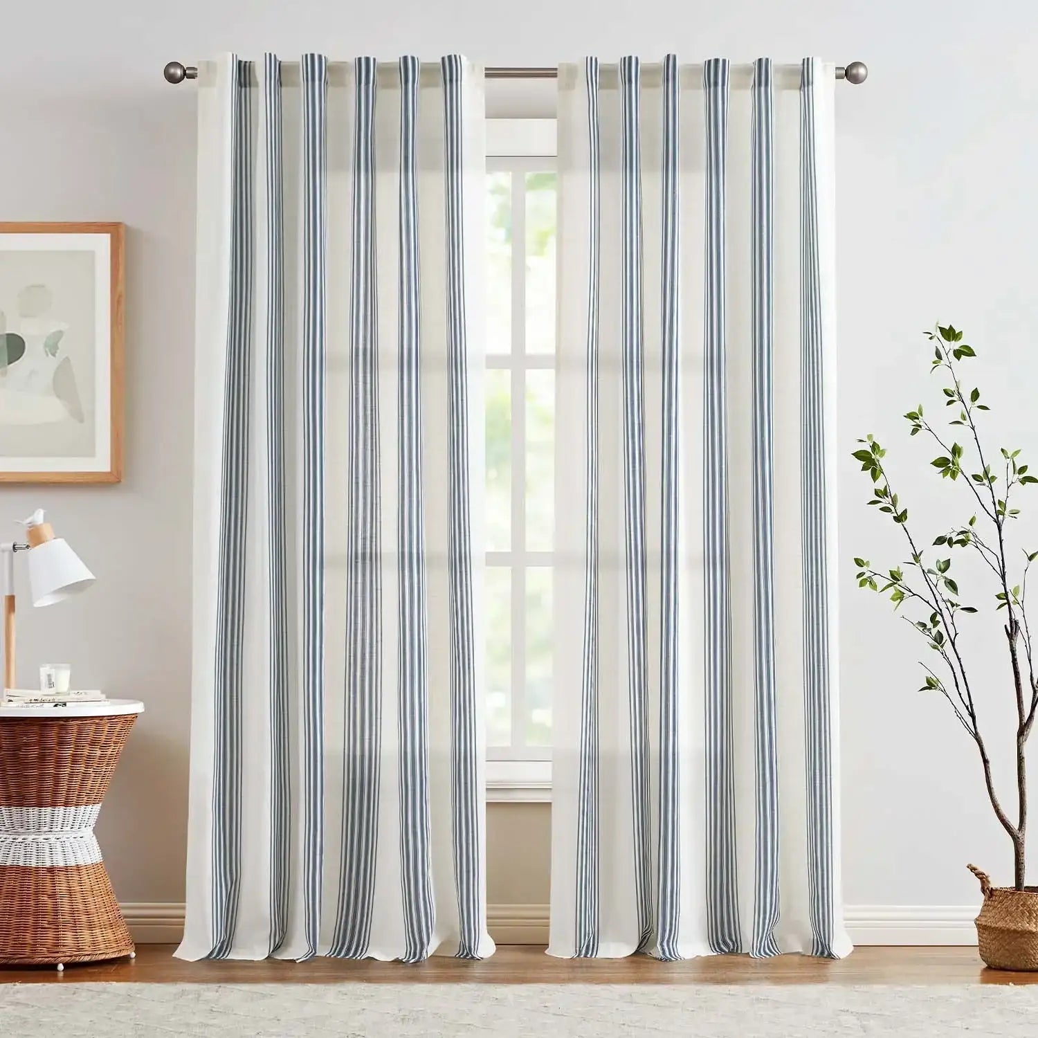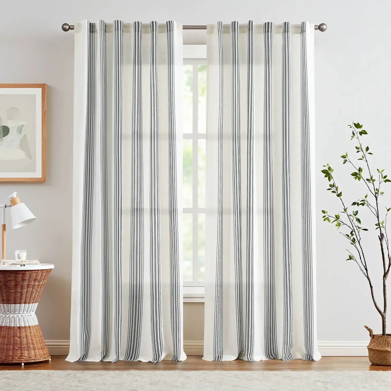 JINCHAN Balanced Stripe 3-in-1 Pleated Curtains bring a rustic yet modern touch to any room. Featuring classic Ticking Stripe patterns—narrow multi-colored vertical stripes alternating with wider background tones—these curtains add French country and farmhouse charm while creating a visually taller, brighter, and more open space. Made from a soft linen-blend fabric, the semi-sheer material allows natural light to brighten your room while providing everyday privacy. Each set includes two panels, designed to drape beautifully with gentle folds. With versatile 3-in-1 hanging options, these curtains fit most standard rods and complement a variety of home décor styles.