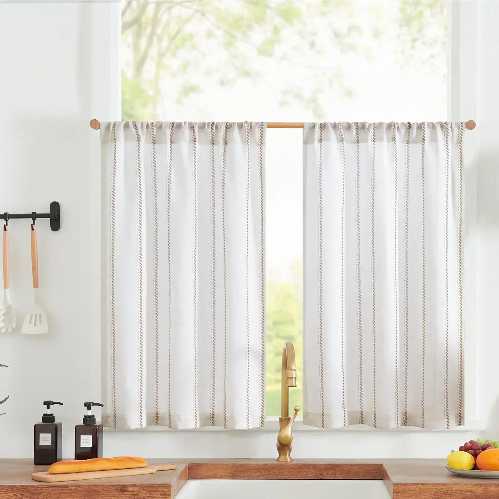 JINCHAN Linen Striped Kitchen Curtains feature a textured linen-blend fabric with charming vertical stripes, adding a warm, rustic touch to any kitchen or small window.