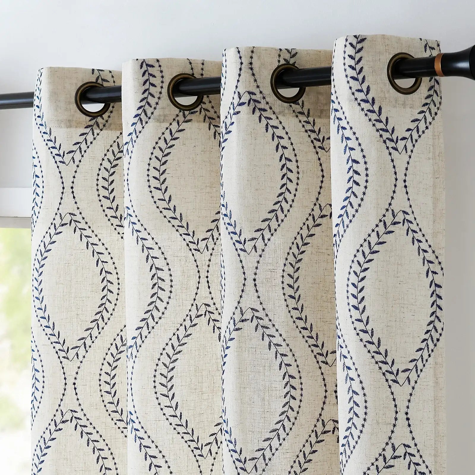 Each set includes two panels with embroidered leaf and ogee wave designs, enhancing living rooms, bedrooms, or any window needing a country-style accent.