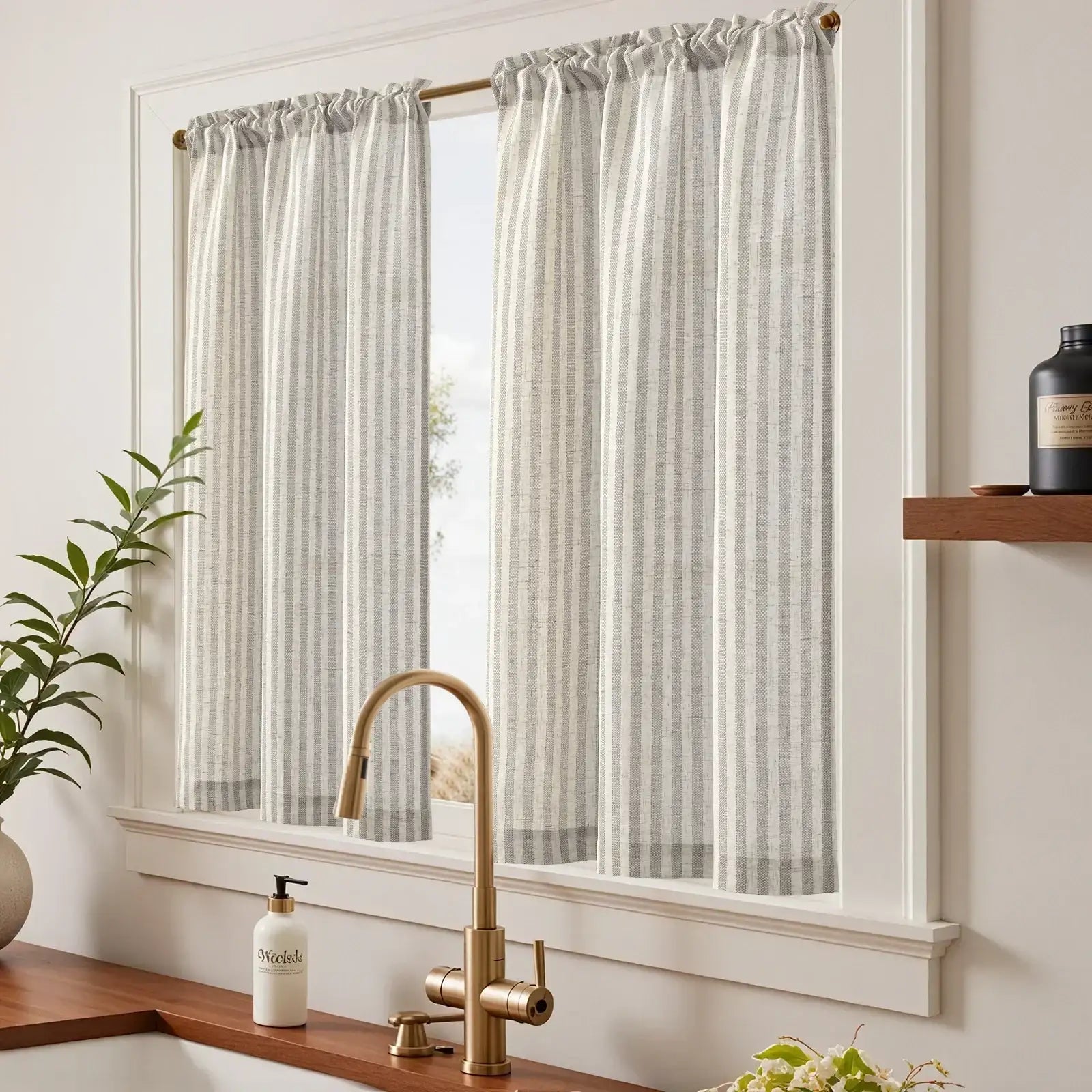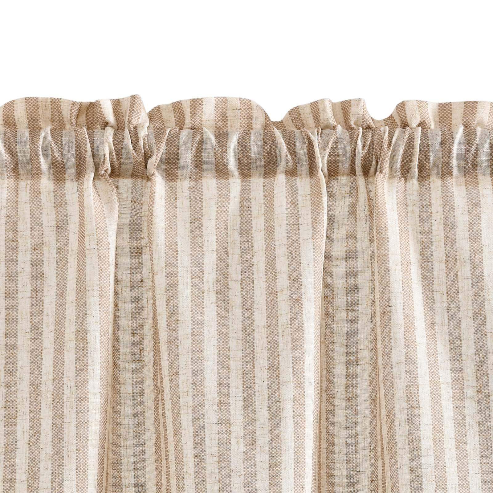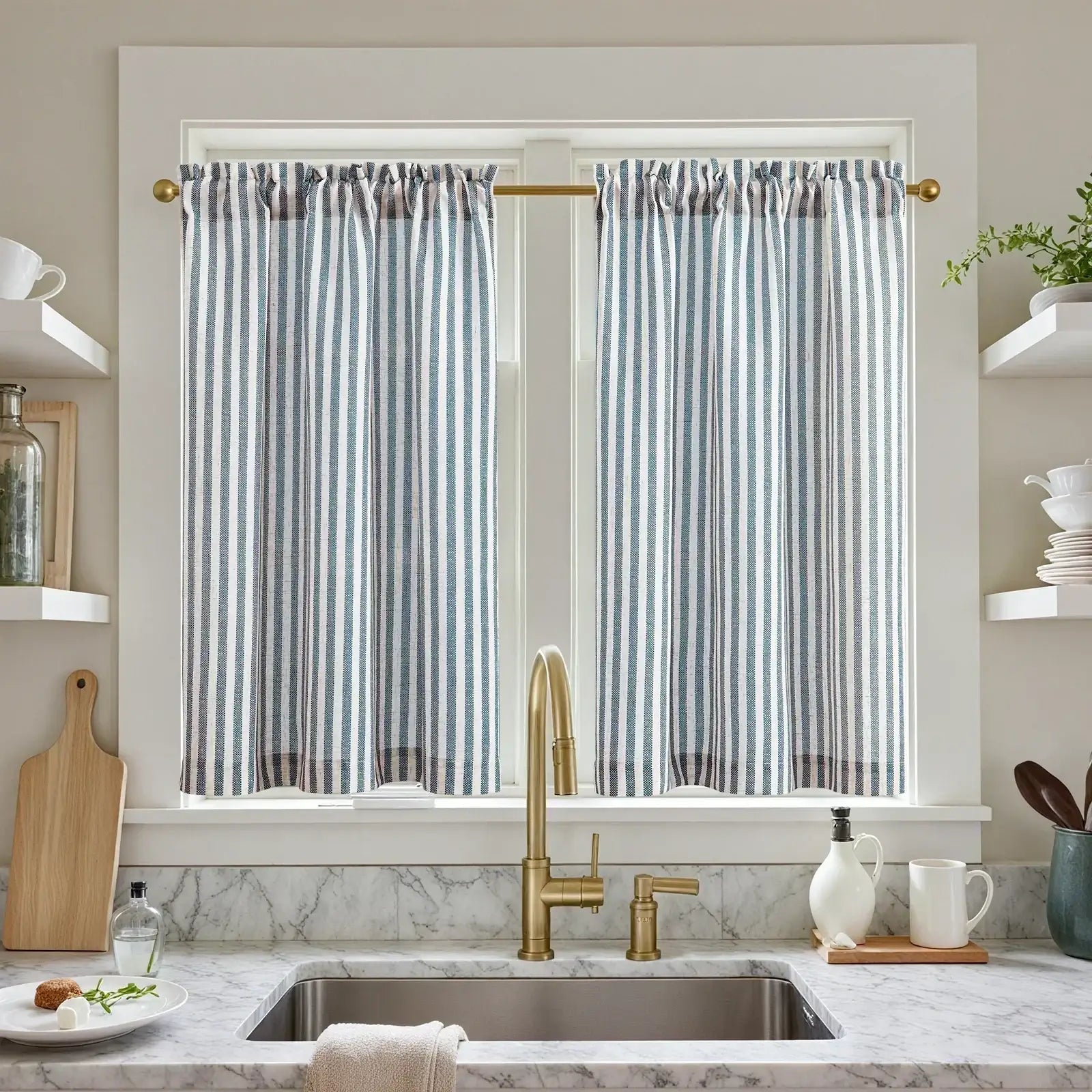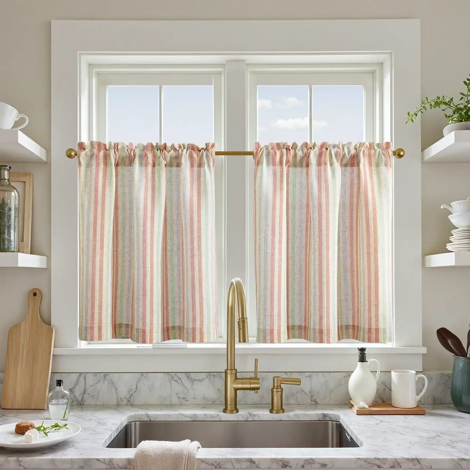 JINCHAN Colorful Striped Linen Wood Ear Edge Kitchen Curtains feature a polyester–linen blend with a classic vertical stripe pattern, adding a modern farmhouse touch to any kitchen.