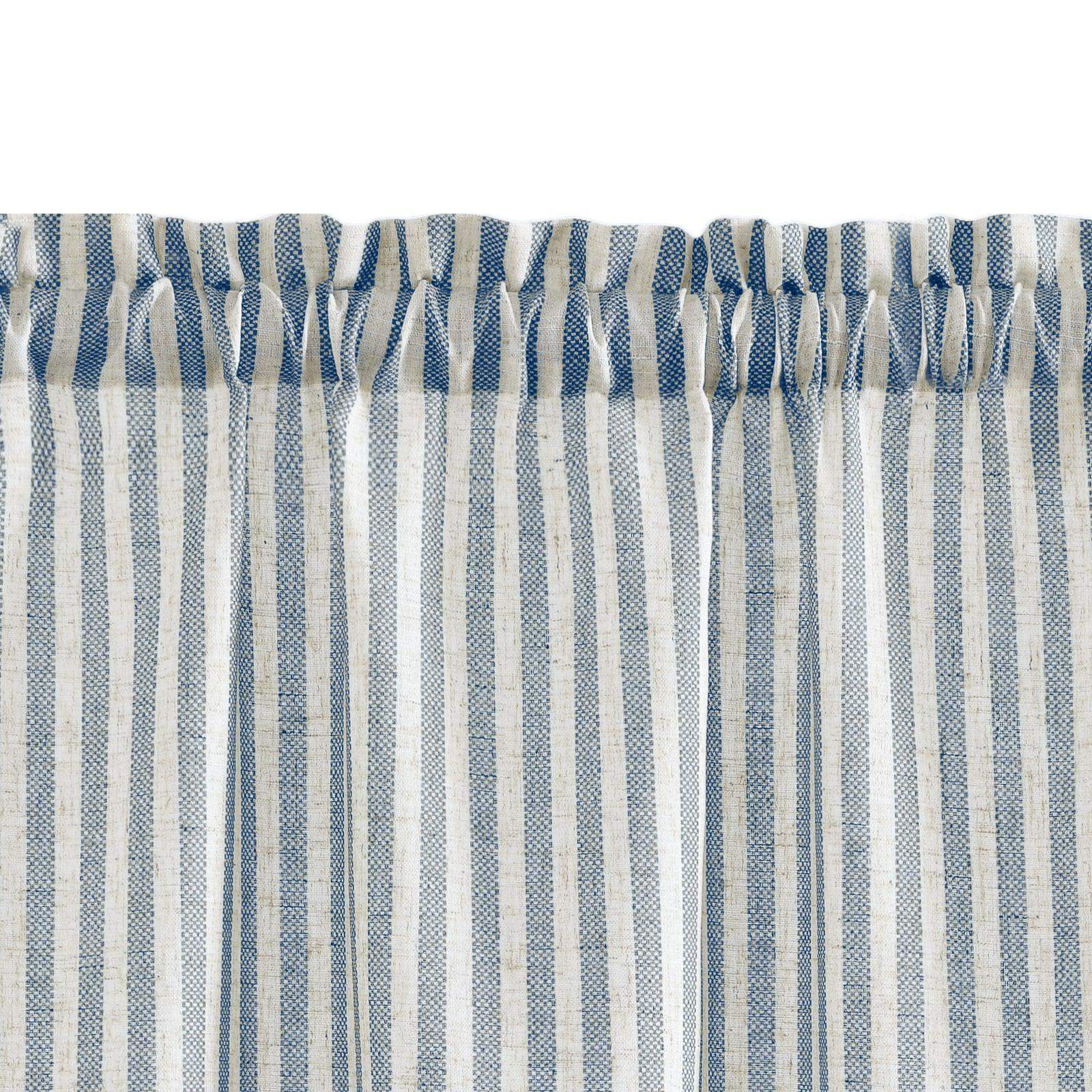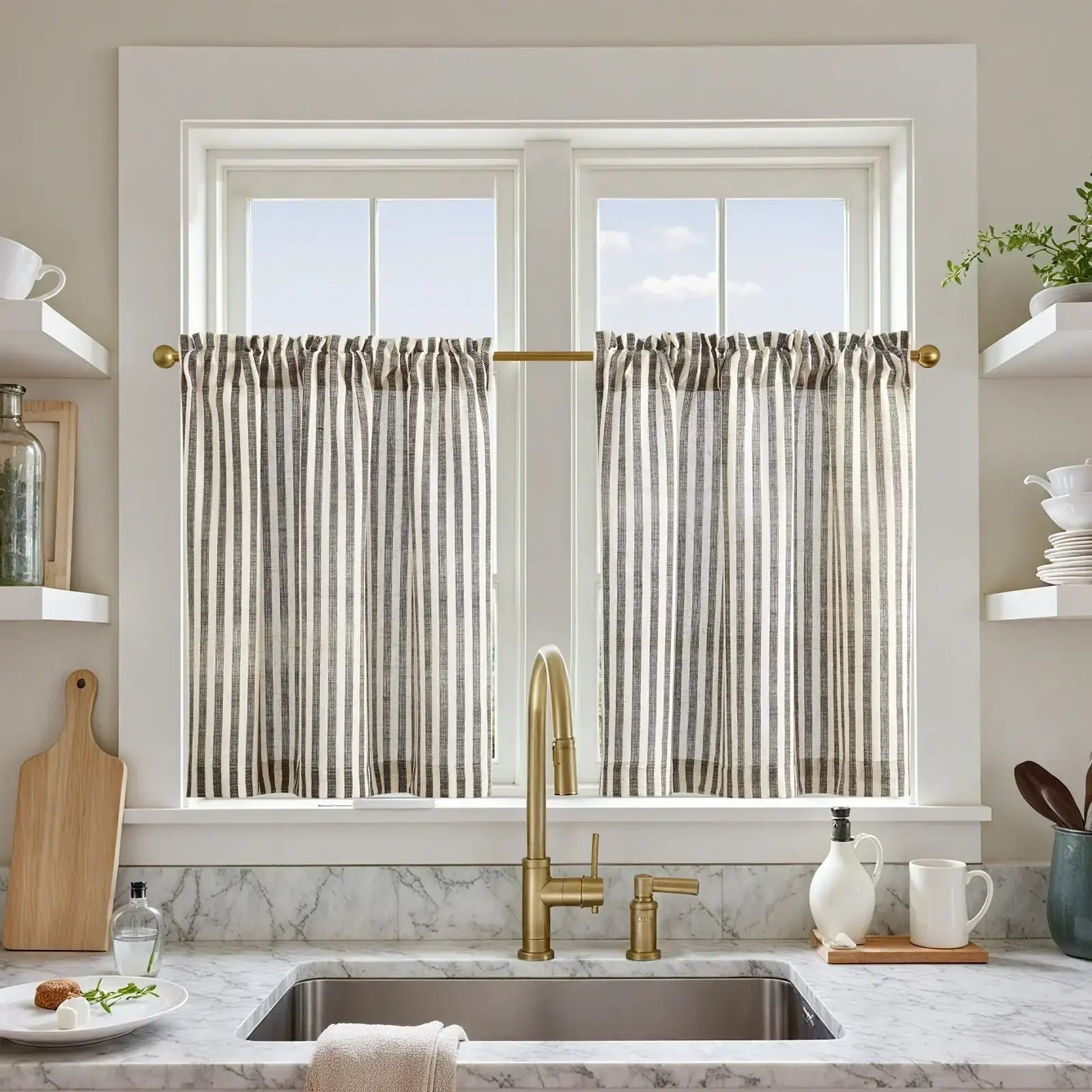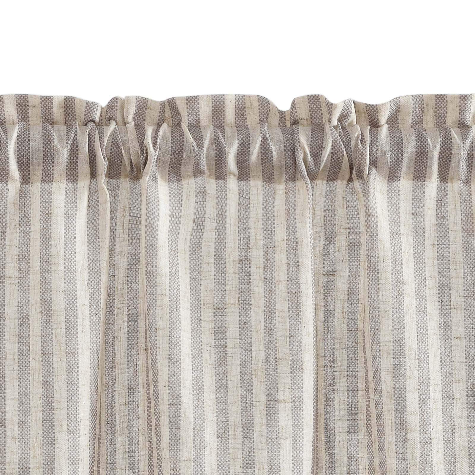 JINCHAN Colorful Striped Linen Wood Ear Edge Kitchen Curtains feature a polyester–linen blend with a classic vertical stripe pattern, adding a modern farmhouse touch to any kitchen.