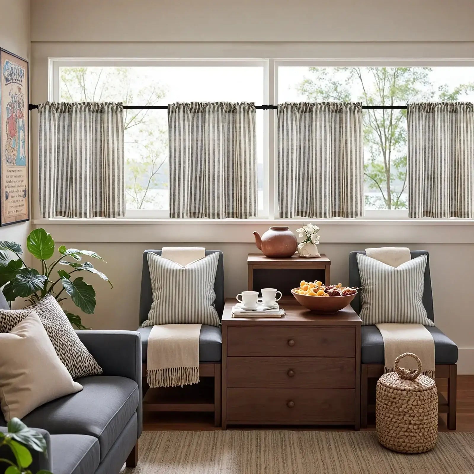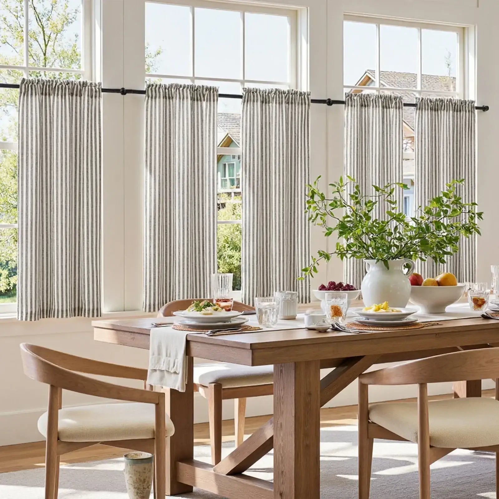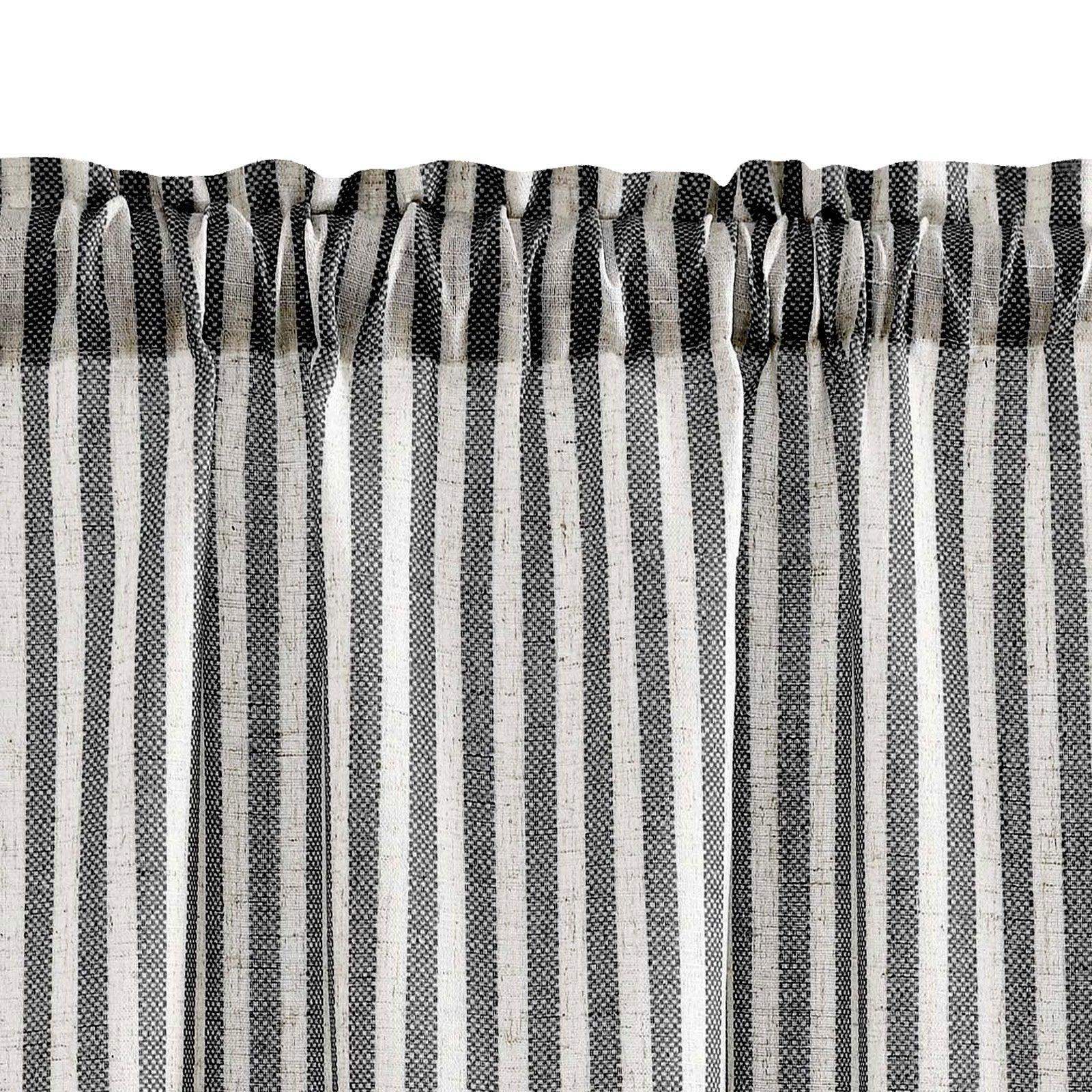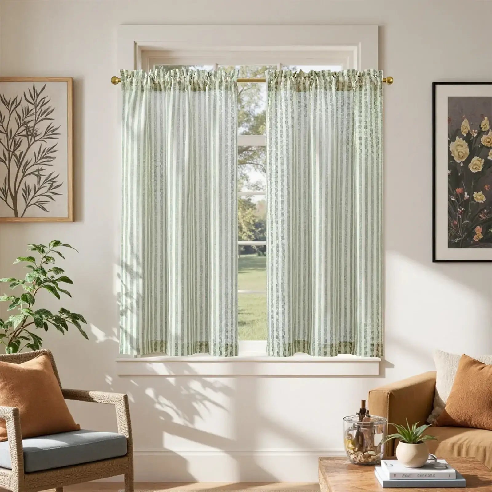 JINCHAN Colorful Striped Linen Wood Ear Edge Kitchen Curtains feature a polyester–linen blend with a classic vertical stripe pattern, adding a modern farmhouse touch to any kitchen.