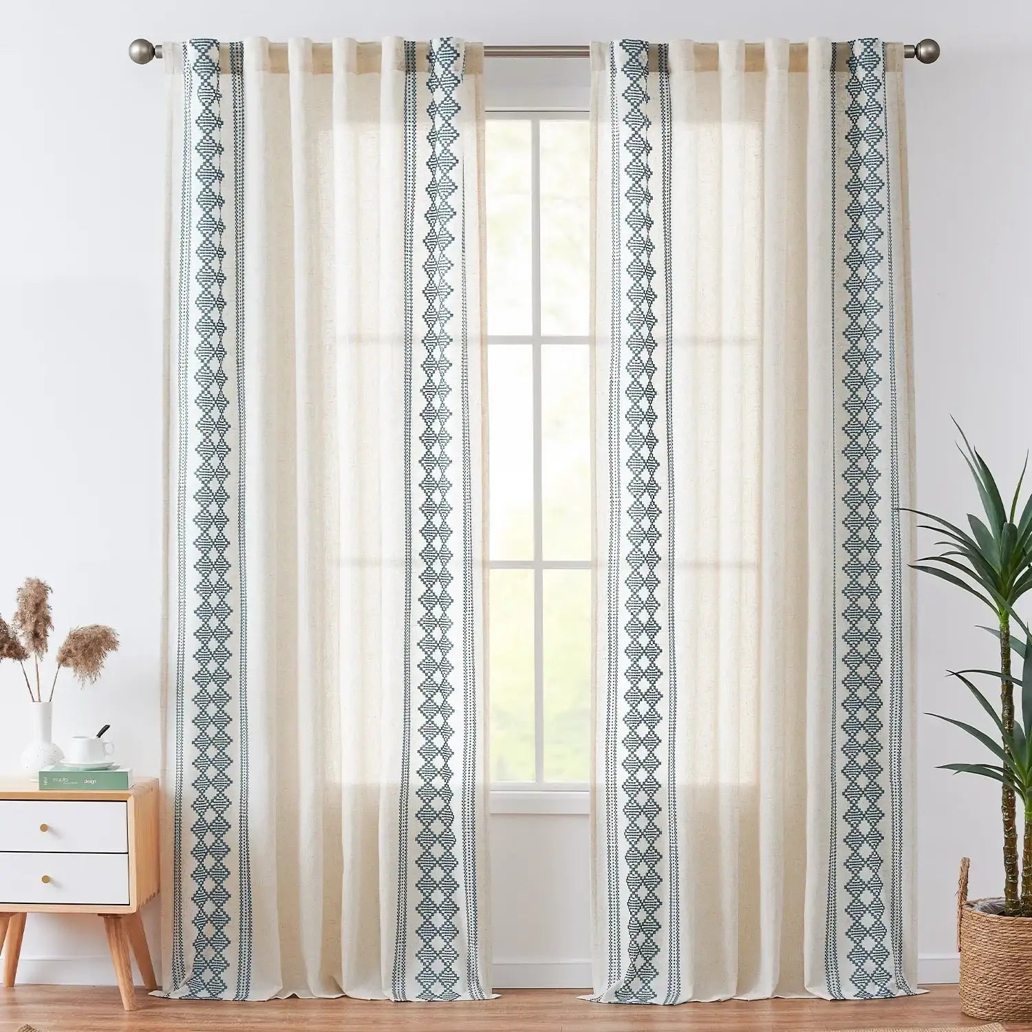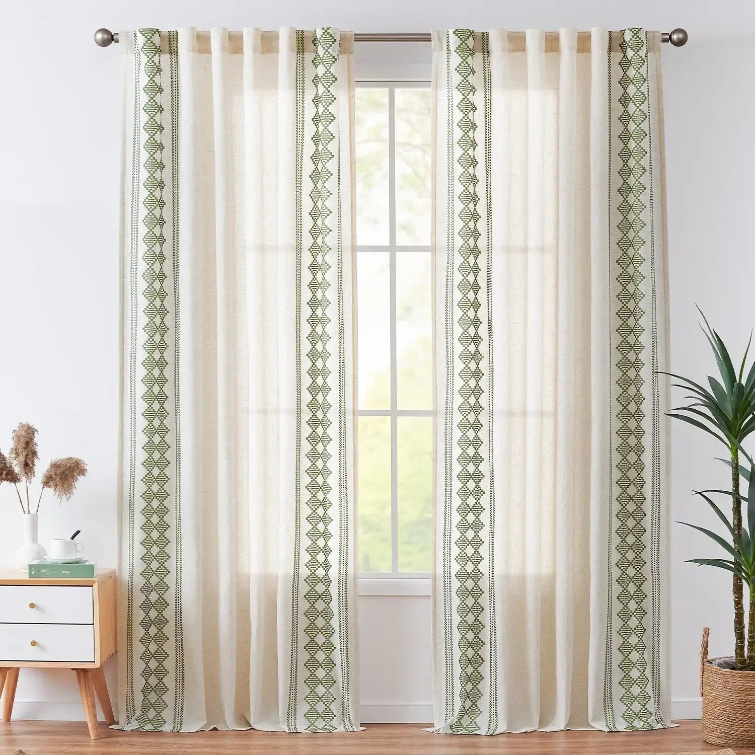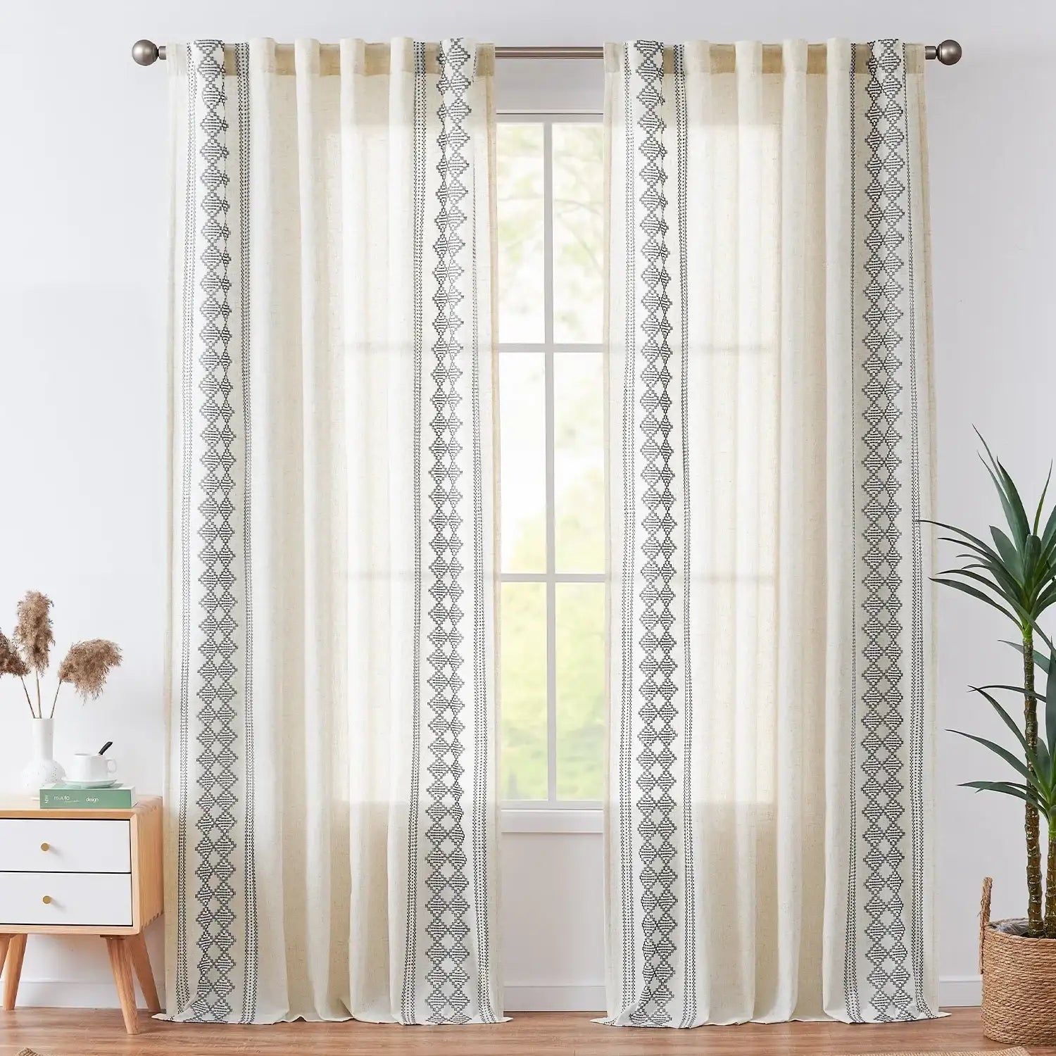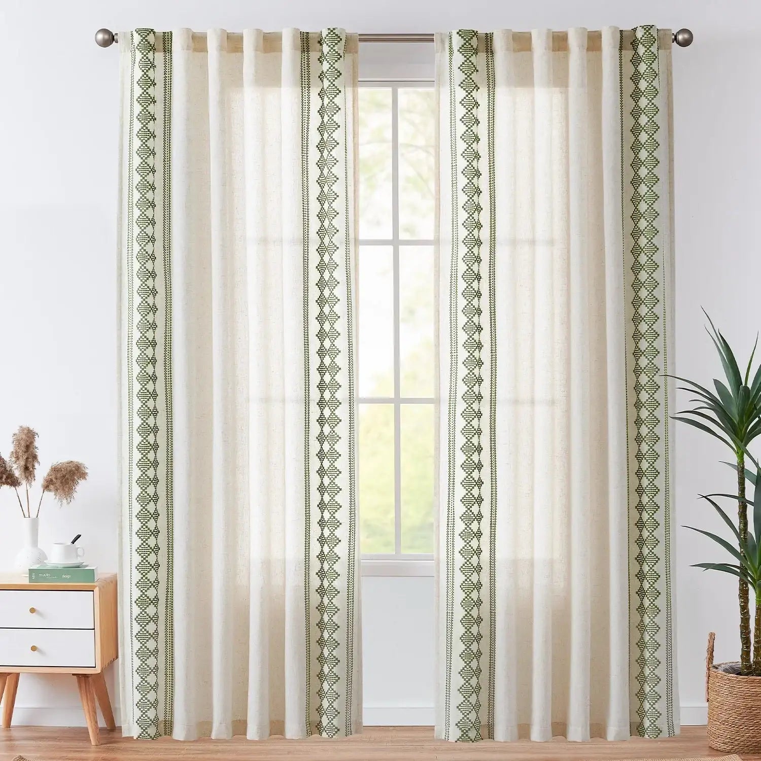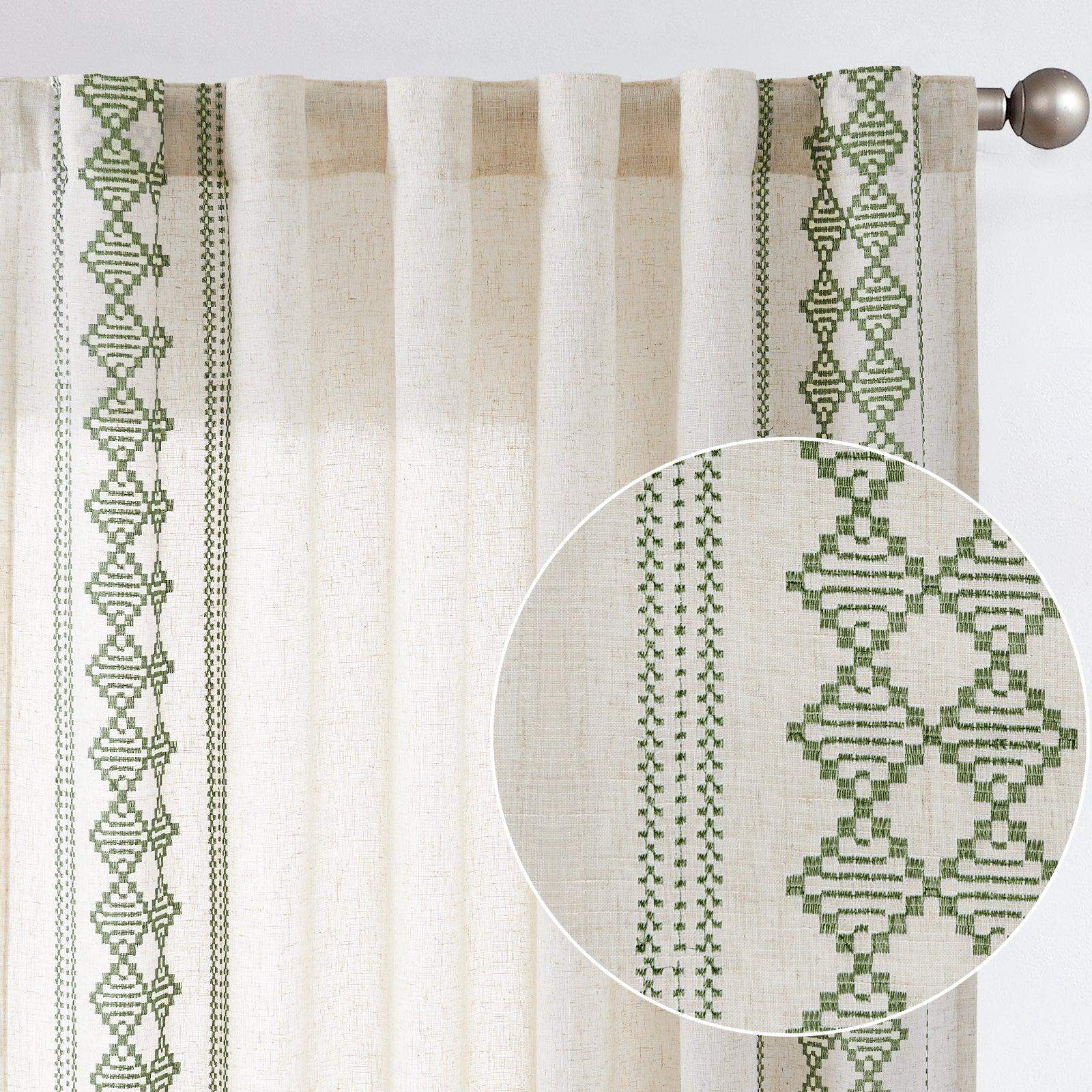 JINCHAN Embroidered Boho Linen Curtains bring a relaxed, bohemian touch to your windows. Made from a soft linen blend, these curtains feature a bohemian geometric jacquard pattern, often called “ikat geometric stripes” or “Moroccan block jacquard.” Woven with colored threads on a cotton-linen blend fabric, the design integrates naturally with the texture, giving a rich tactile feel. Lightweight and airy, they filter sunlight while brightening your space. Perfect for bedrooms, living rooms, or any area where a casual, artistic vibe is desired.