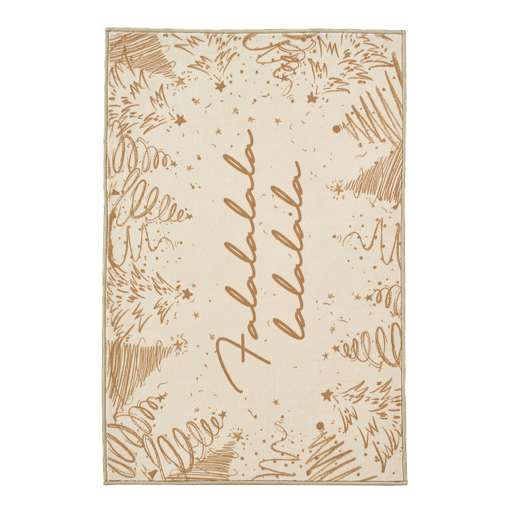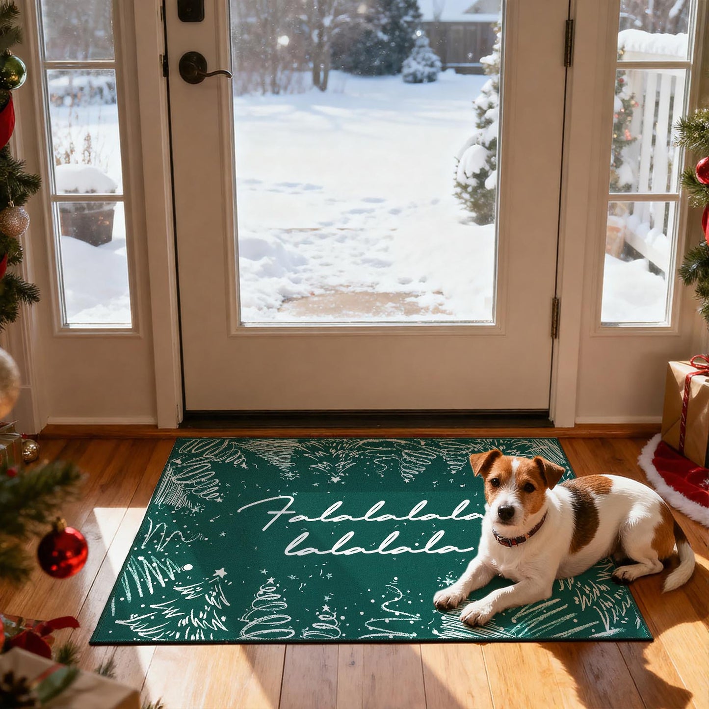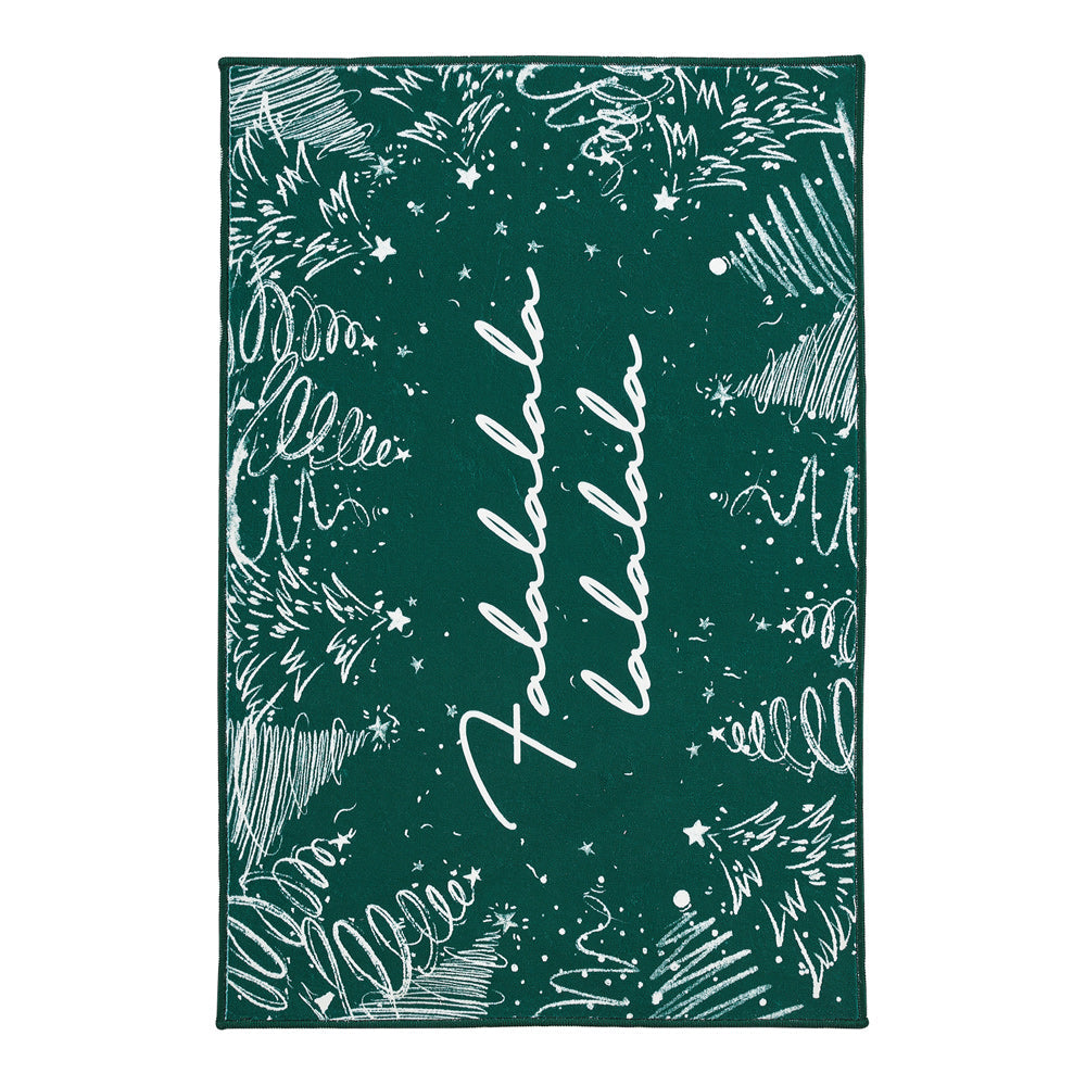 Featuring playful hand-drawn Christmas trees, sparkling stars, and the iconic “Falalalala lalalala” script, this rug instantly sets a joyful mood for the season.
