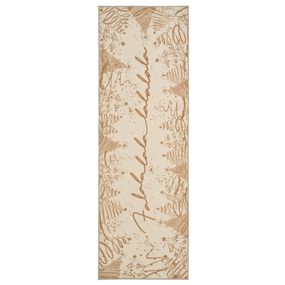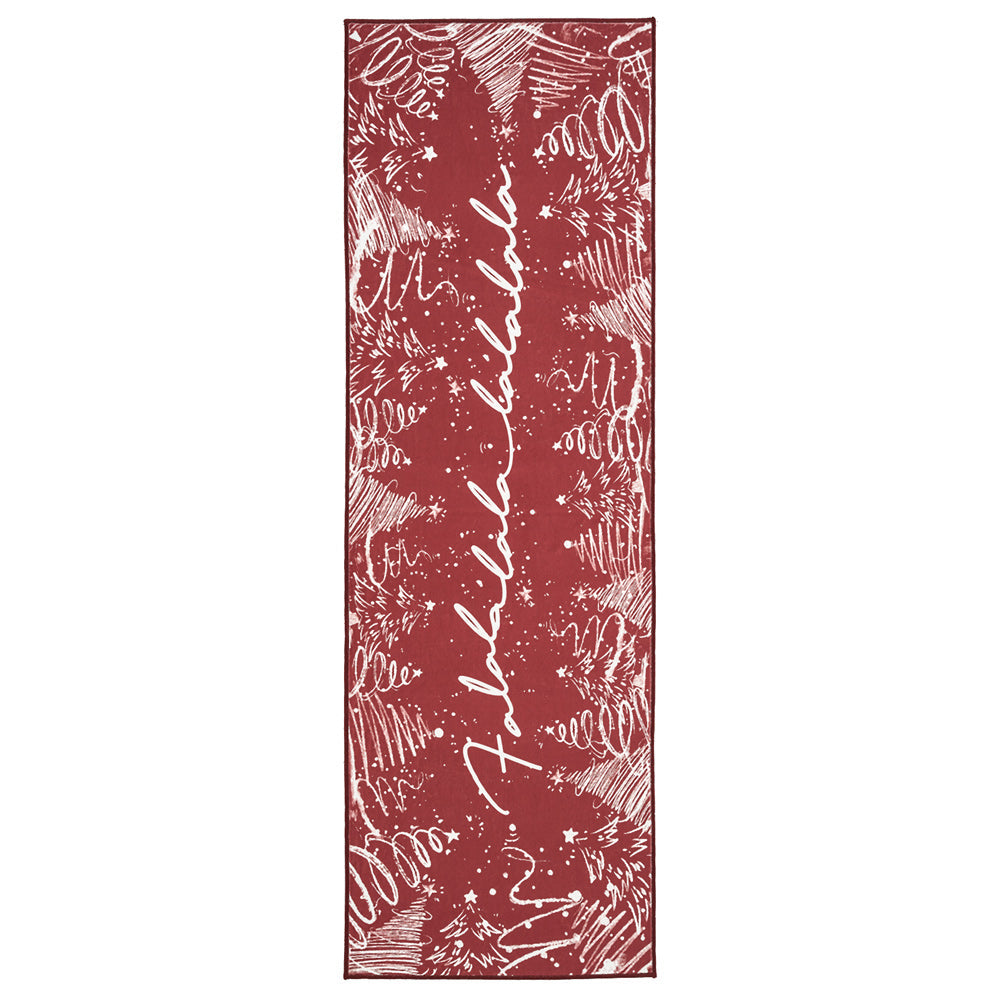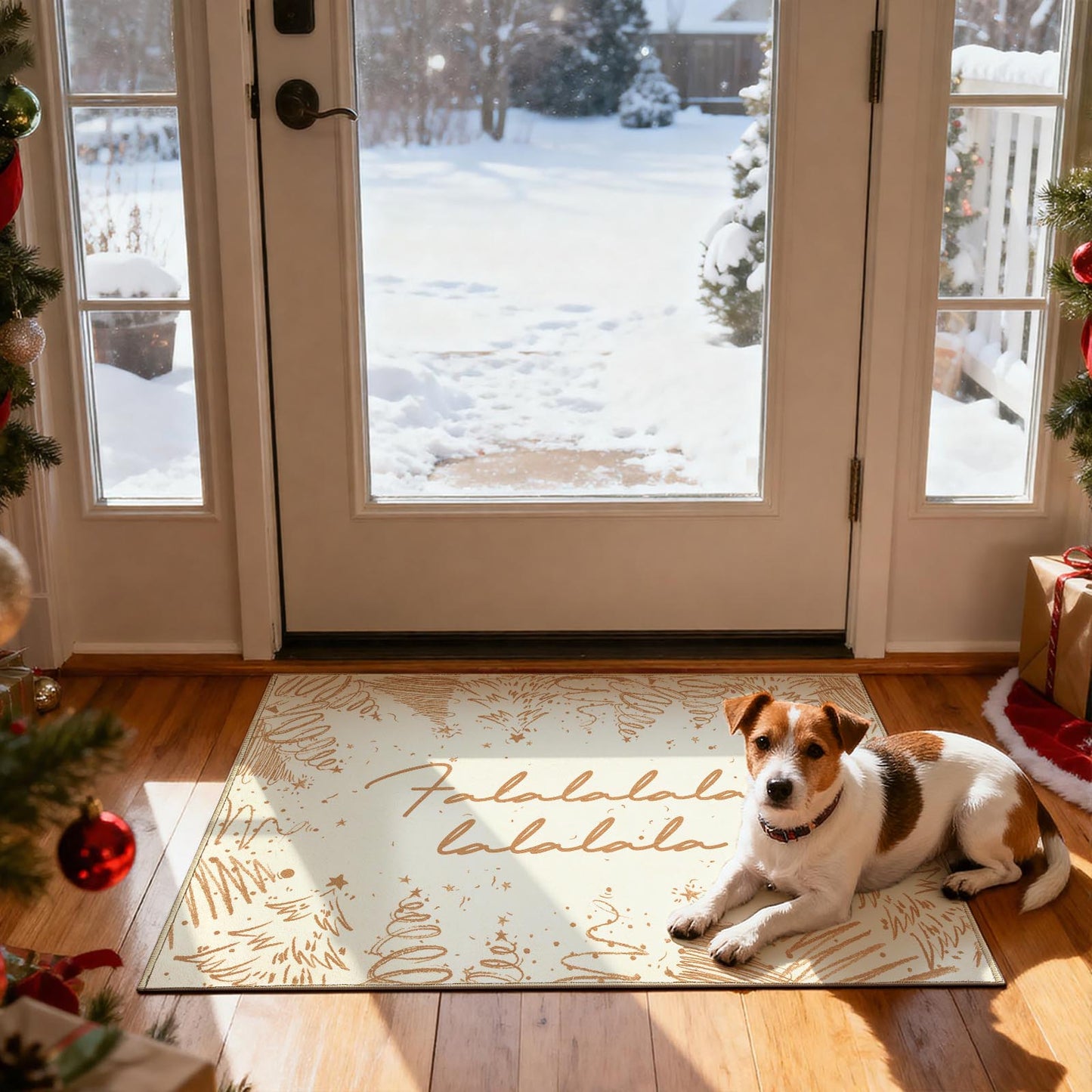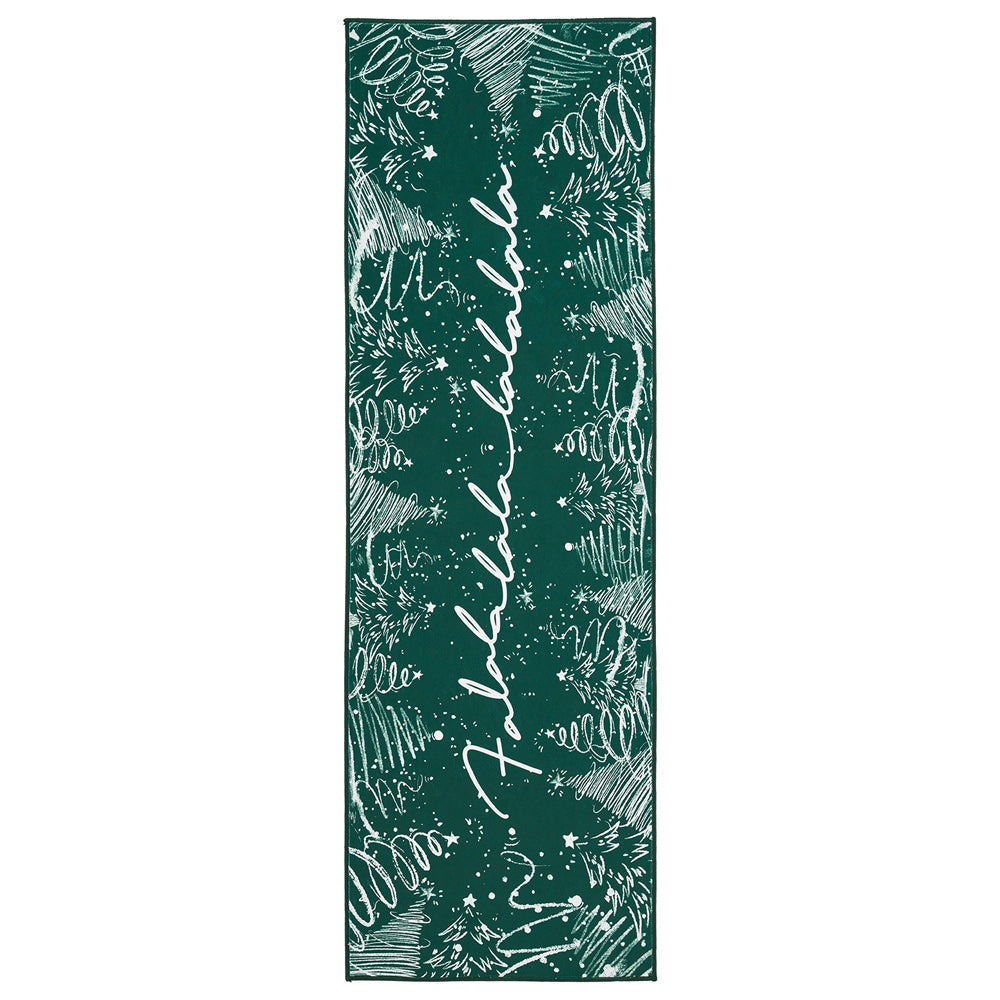 Featuring playful hand-drawn Christmas trees, sparkling stars, and the iconic “Falalalala lalalala” script, this rug instantly sets a joyful mood for the season.
