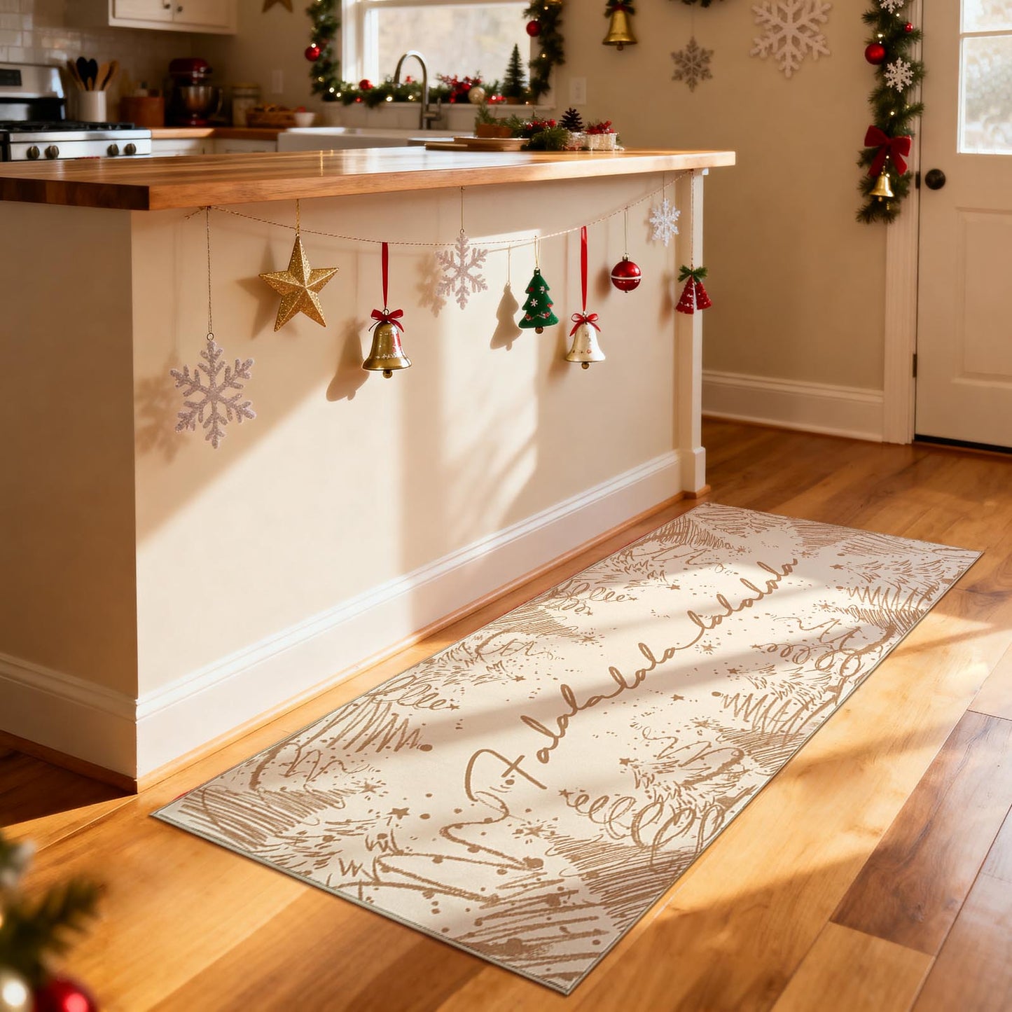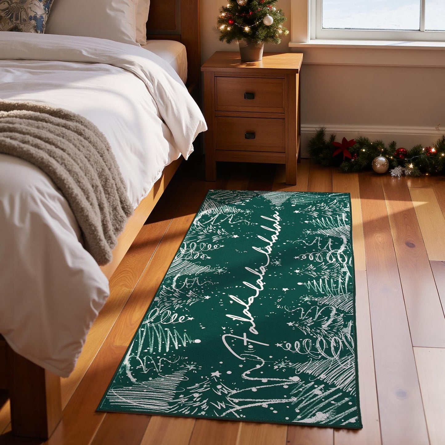 Bring cheerful holiday vibes into your home with the Falalala Holiday Script Rug from Jinchan.