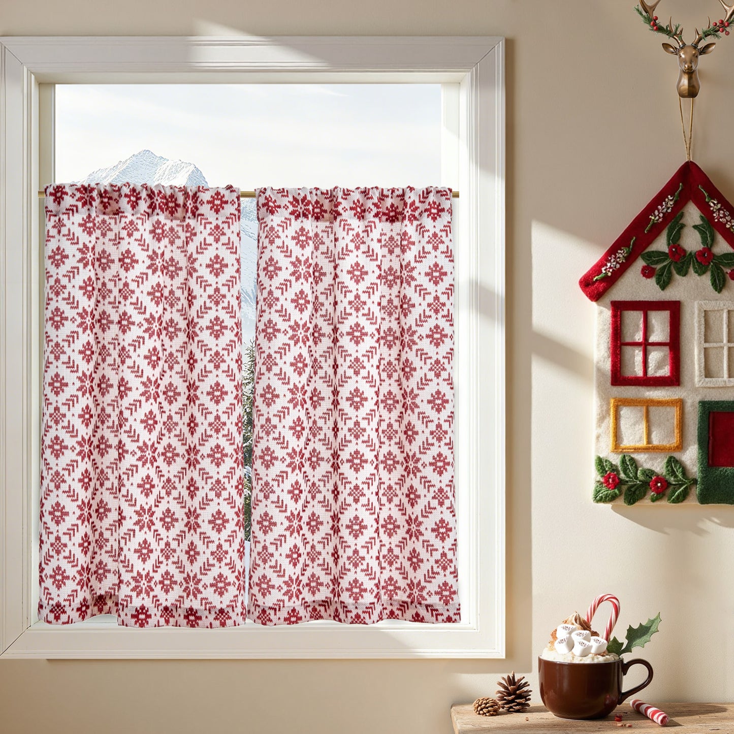Bring the cozy charm of a winter cabin into your home with the Nordic Snowflake Kitchen Curtain. Featuring a red and white woven snowflake pattern inspired by Scandinavian design, this curtain adds festive warmth and rustic elegance to your holiday décor.
