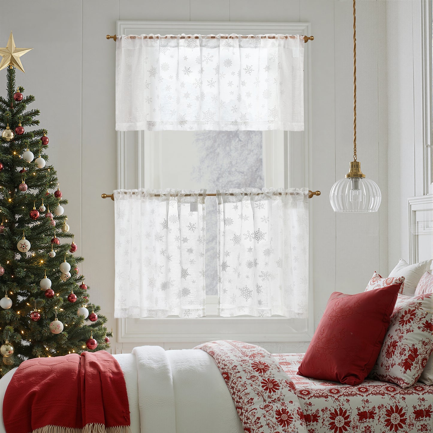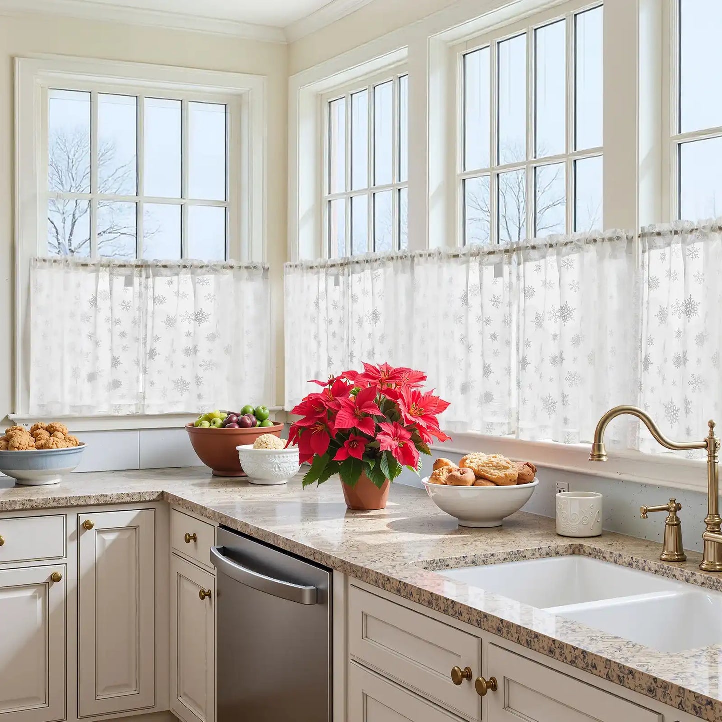 Bring a touch of winter elegance to your home with the Jinchan Off White Embroidered Snowflake Kitchen Curtain. Featuring delicate embroidered snowflakes on soft, off-white fabric, this valance blends timeless sophistication with festive charm — perfect for brightening any space this holiday season and beyond.