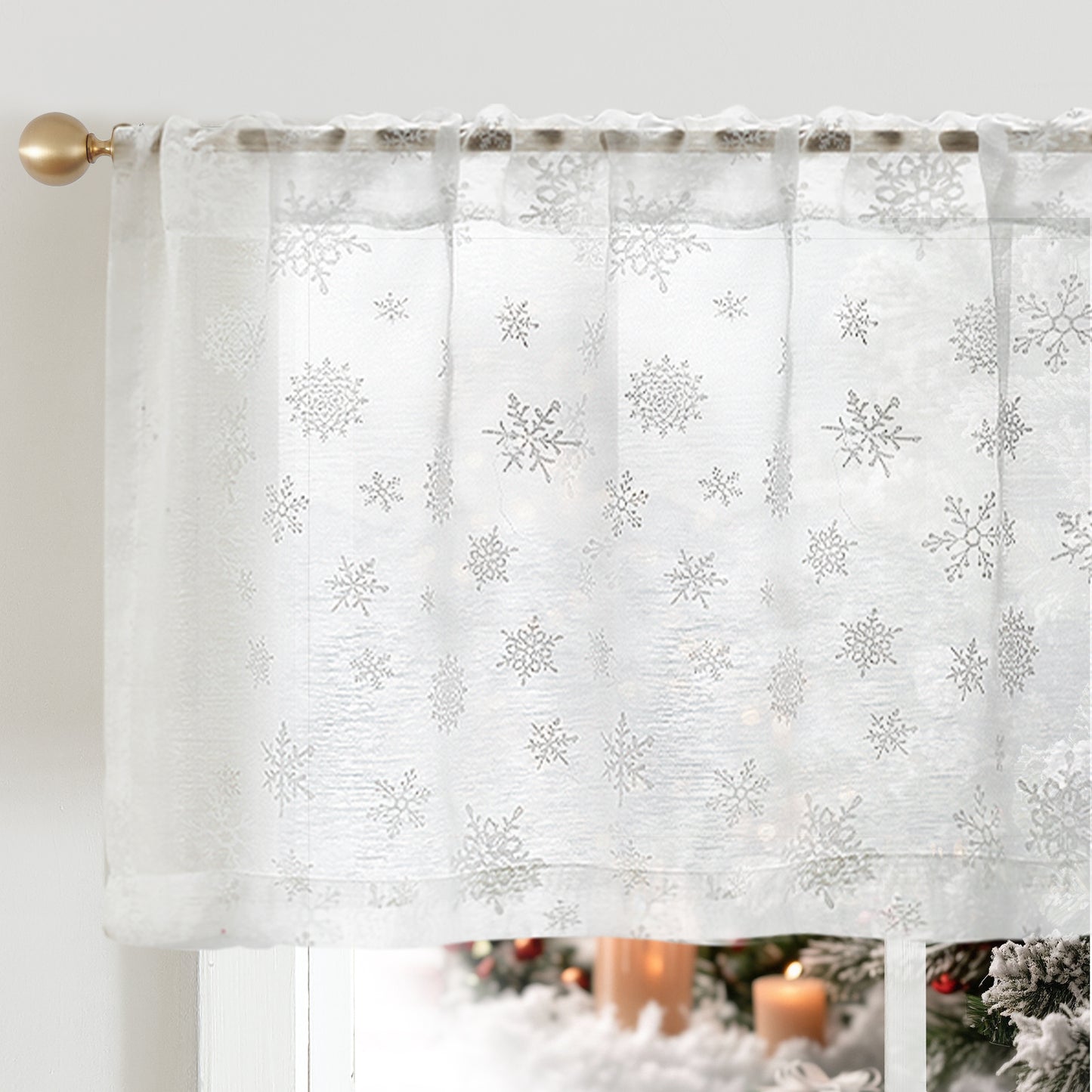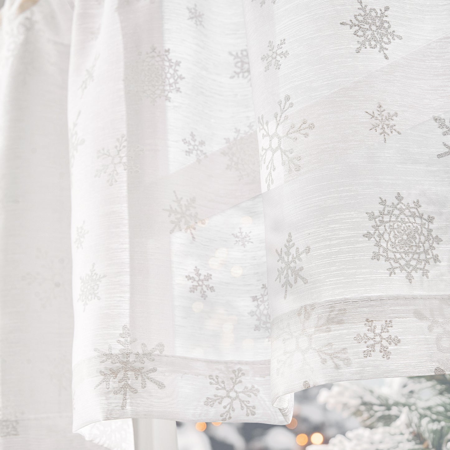 Bring a soft winter shimmer to your windows with the Snowflake Glow Top Curtain. Featuring delicate embroidered snowflakes on sheer white fabric, this elegant valance captures the magic of falling snow and fills your home with cozy holiday charm.